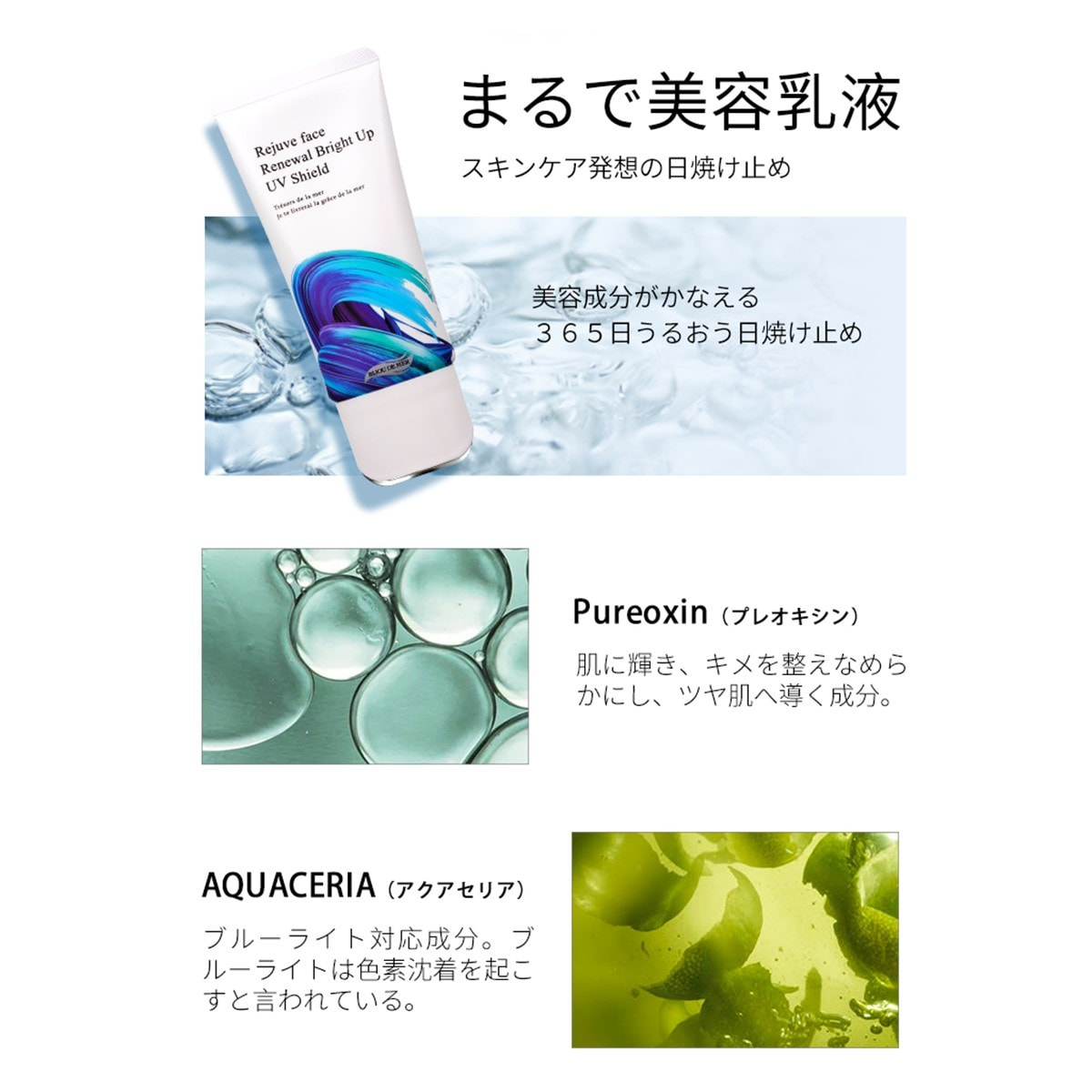 きしみ感やベタつきをおさえ、みずみずしく軽い付け心地なのにしっとりうるおう日焼け止め。