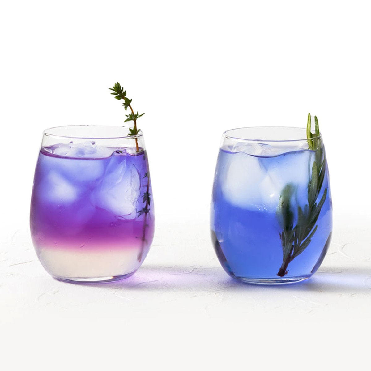 鮮やかなコバルトブルーの色合いが特徴で、レモンを入れると紫色へと変化します。